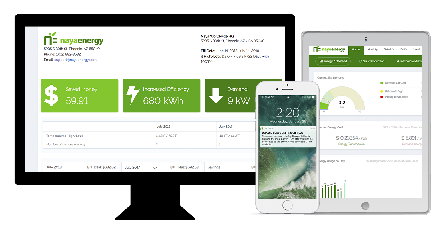 Through machine learning (Nayalytics®), and actionable monitoring (Nayalerts®), we can dramatically lower peak demand charges (the utilities’ legal practice of maximizing their revenue), optimize your maintenance work, and extend the life of your equipment.